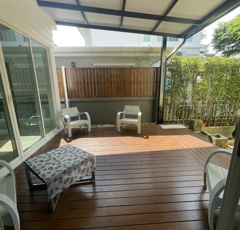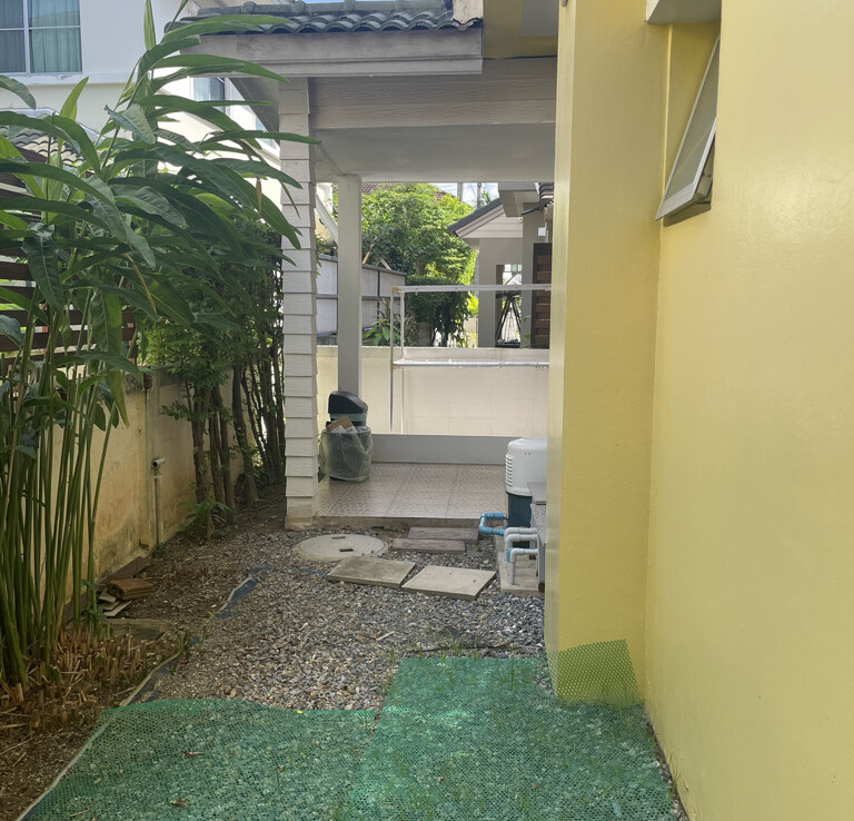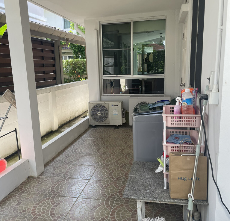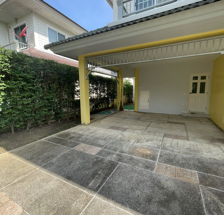 The house features a charming garden, covered parking, and a covered terrace on the right side—perfect for outdoor dining or relaxing in the garden. Inside, the home offers an open-plan living and dining area, along with a fully equipped Western-style kitchen fitted with built-in appliances, including an oven. From the kitchen, there is access to a separate laundry area and Thai kitchen at the rear, where the washing machine is also located.