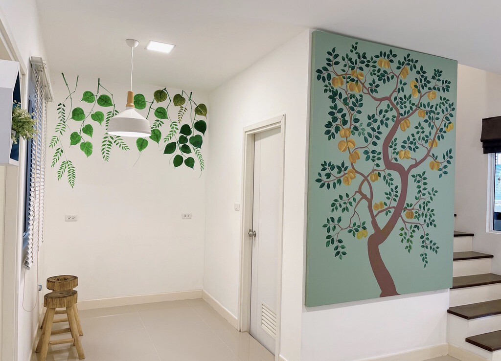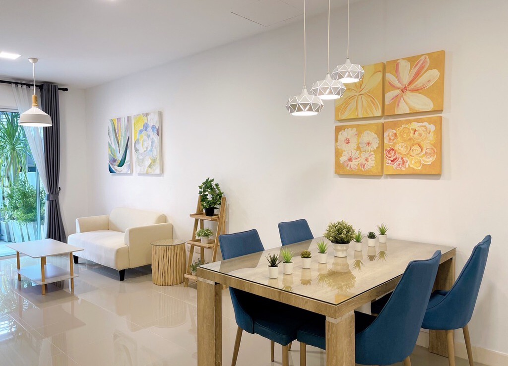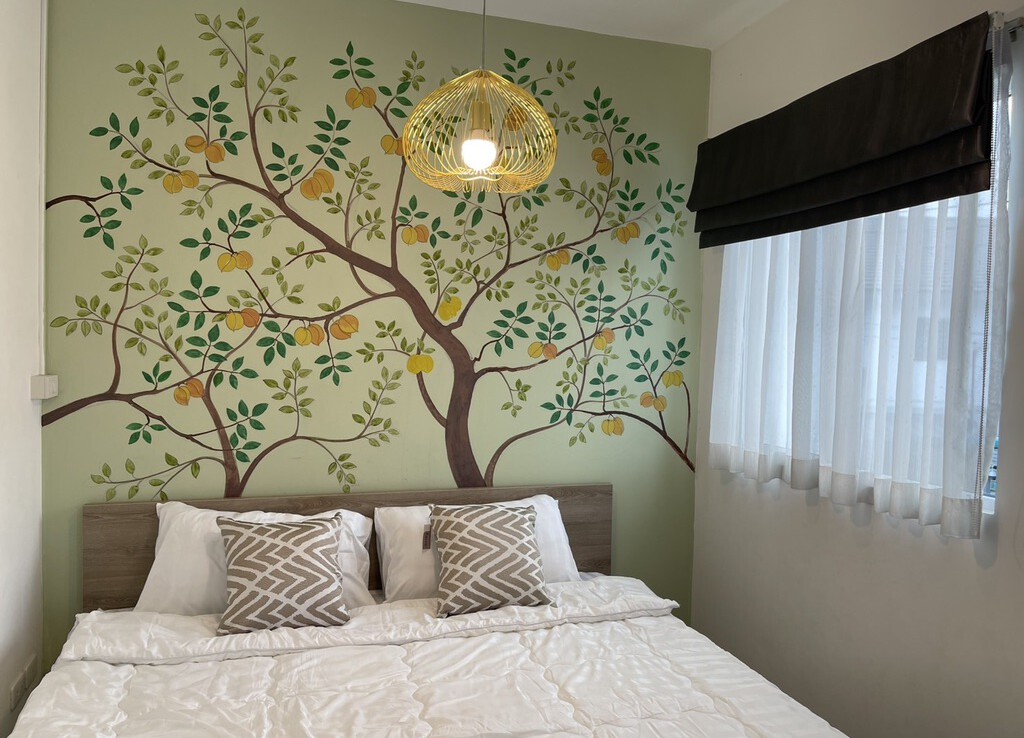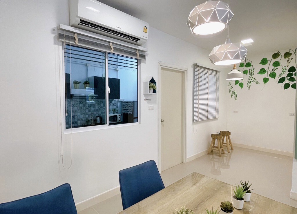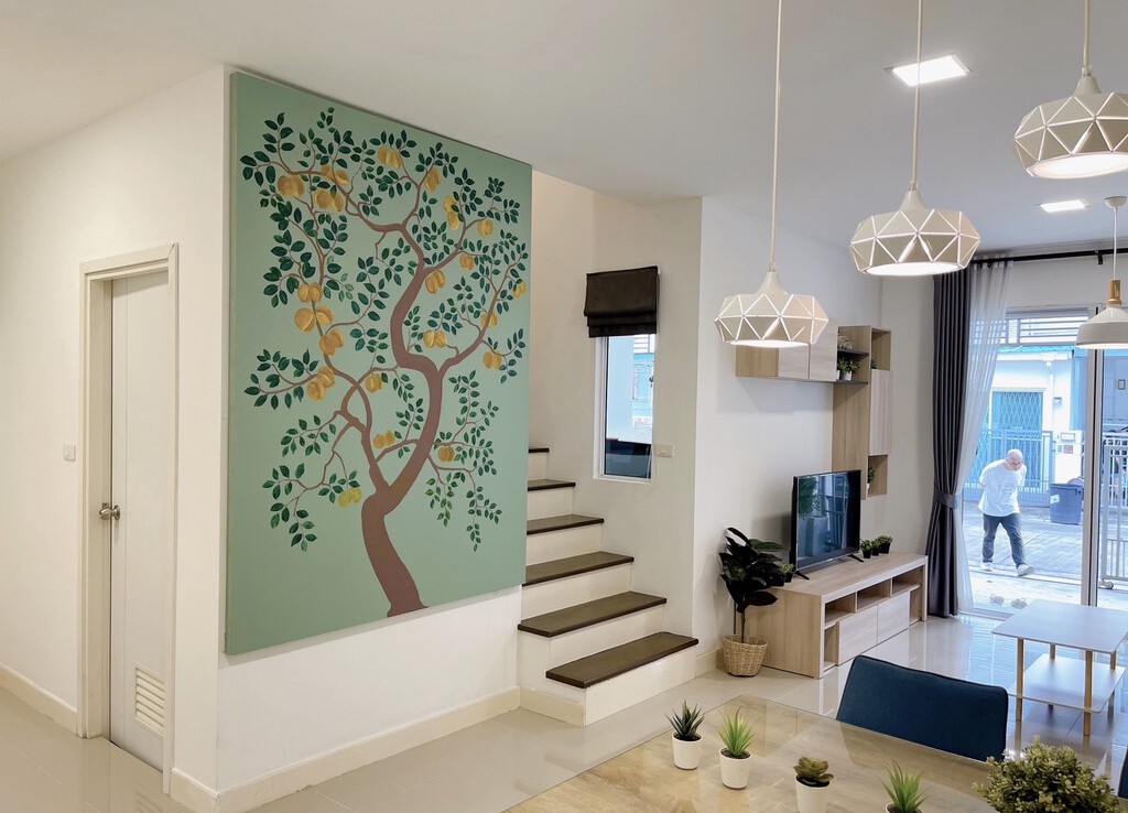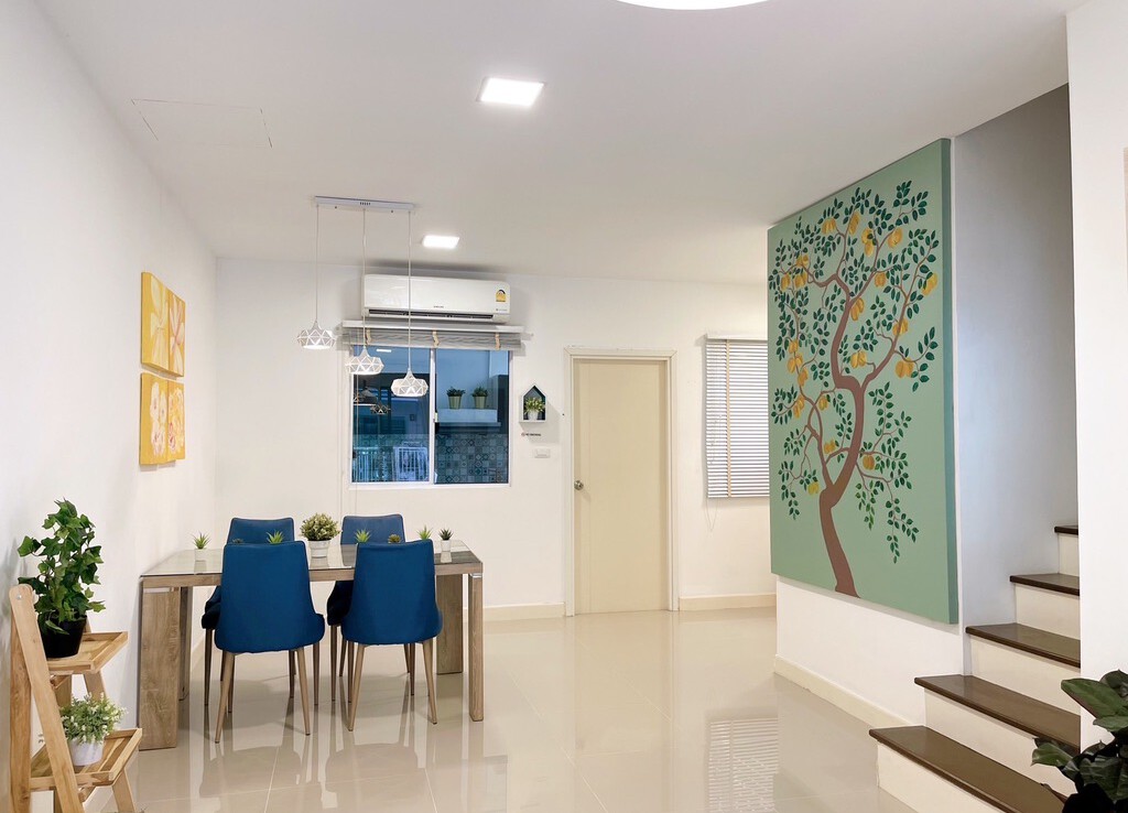 The house is fully furnished with Western style kitchen, hand painted walls feature, parking and a/c. The estate offers green area, auto access card, security and CCTV.