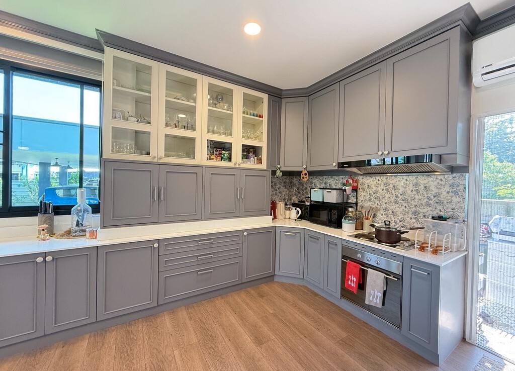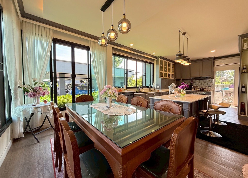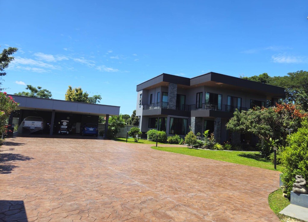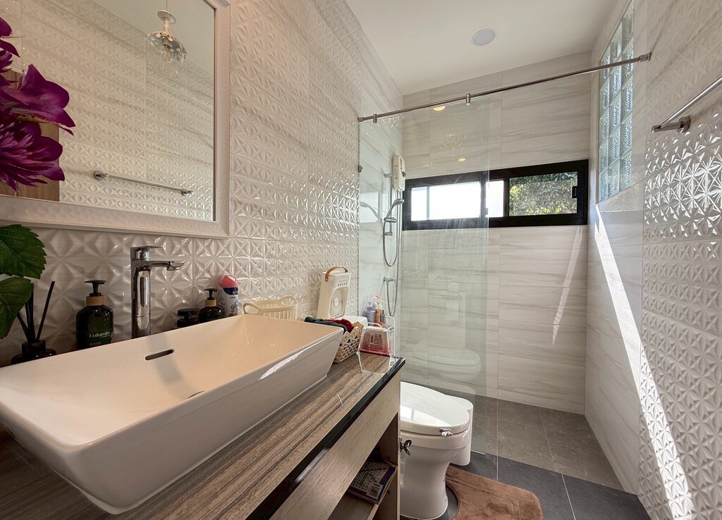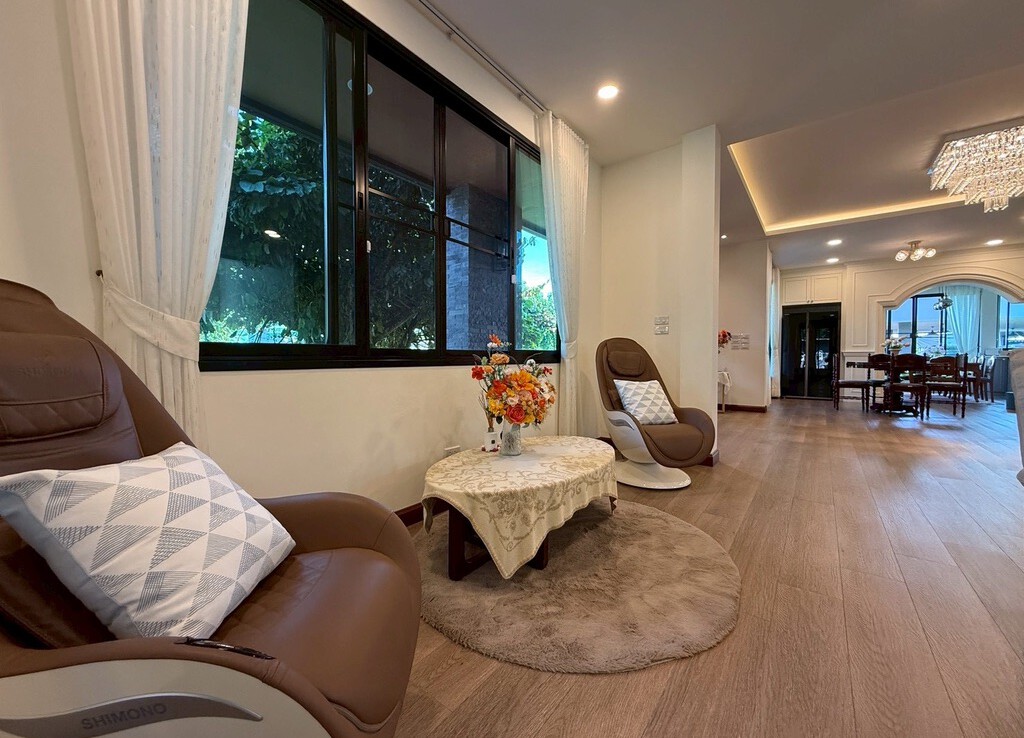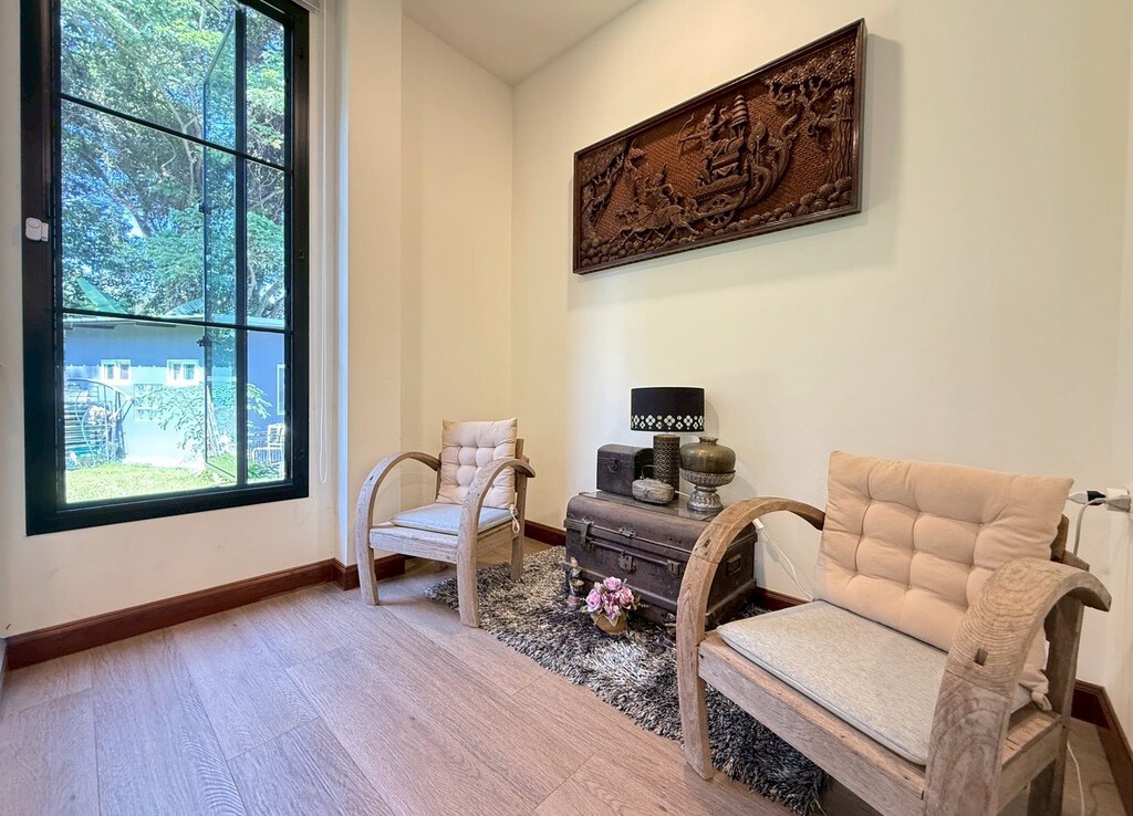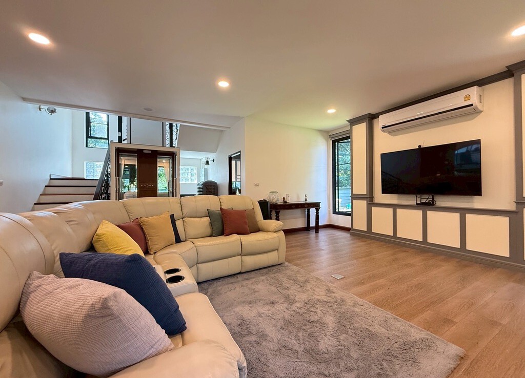 Smart modern style custom built 5 bedroom house with large land is for sale fully furnished in Hang Dong area of Chiang Mai. Occupying just under 1 rai (1600sqm) of land the house is situated amidst tranquil greenery yet within a short driving distance to several international schools. Kad Farang, Big C, fresh market and hospital are all within 10 minutes drive away. About a 30 minutes drive to the airport.