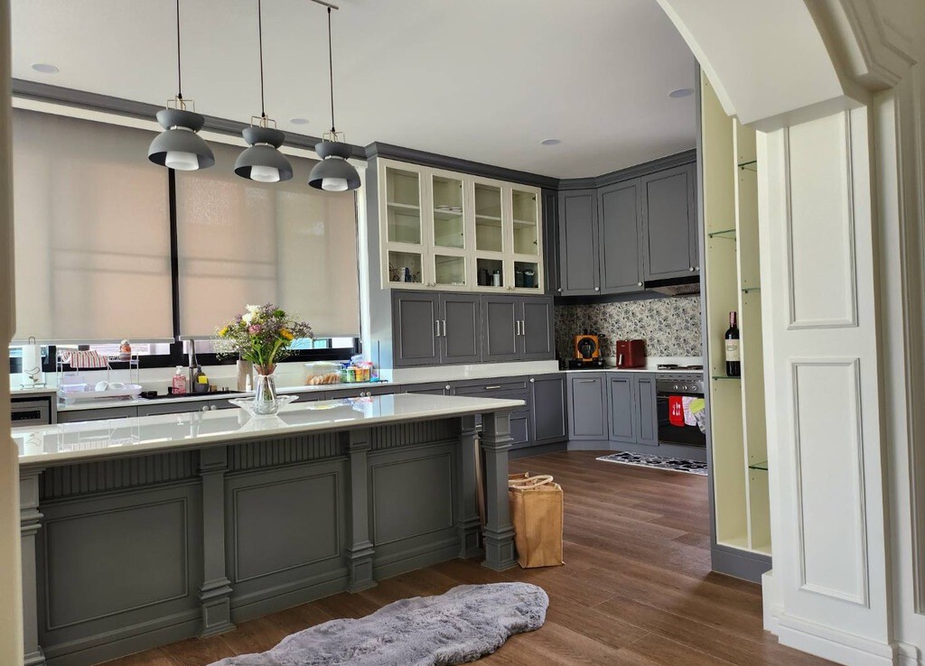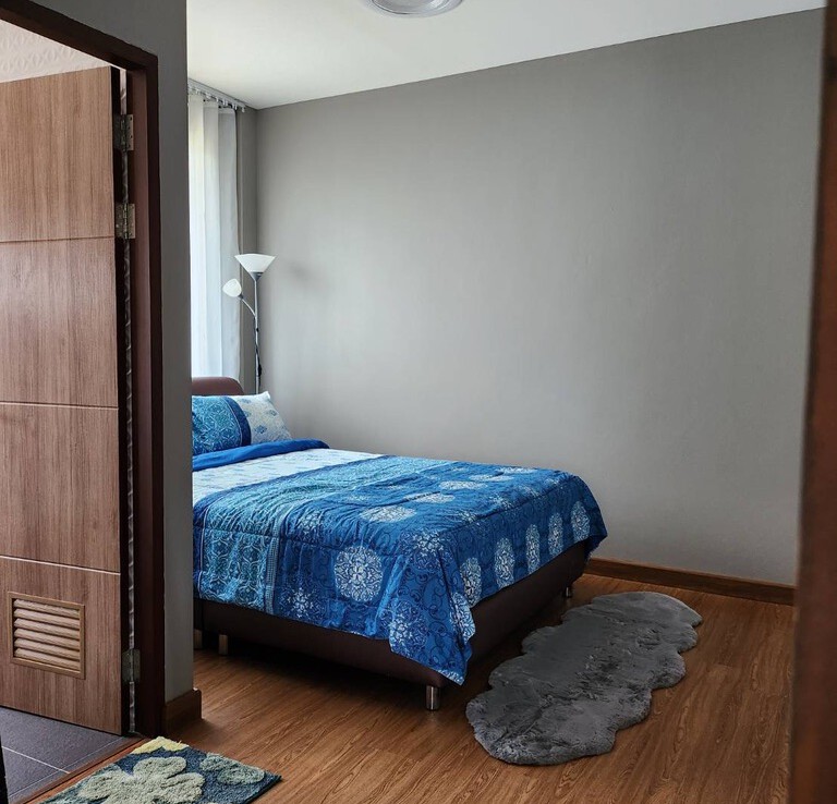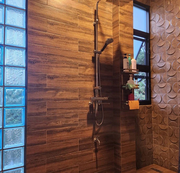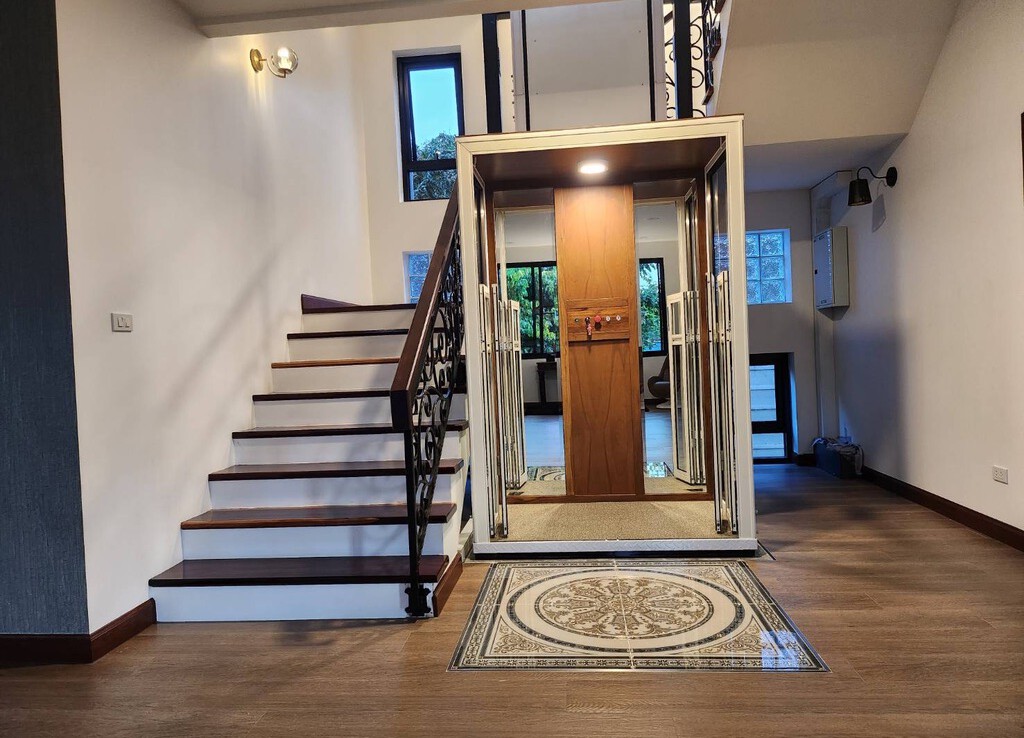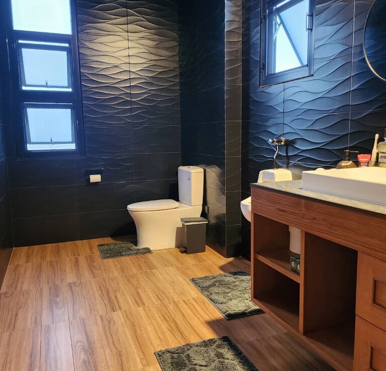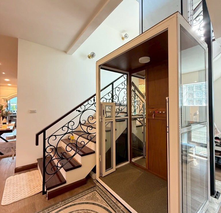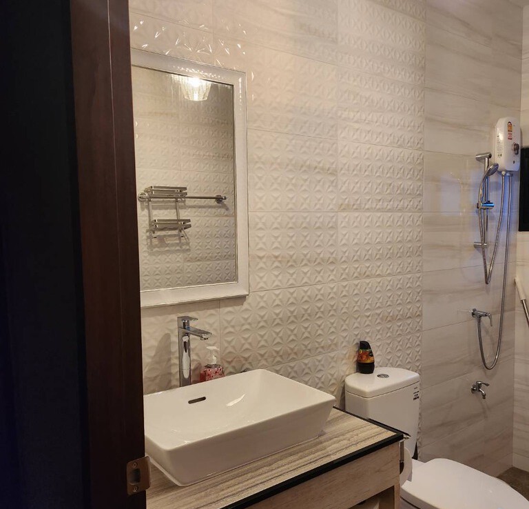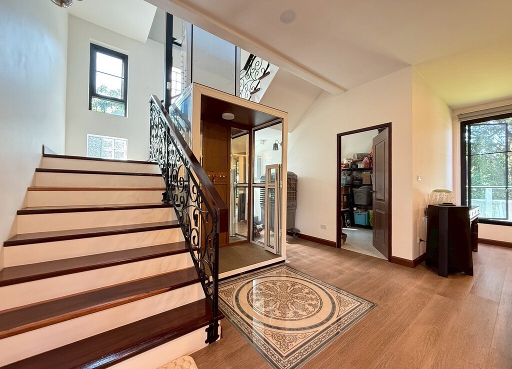 Entering the main house via a digital door lock there is a spacious open plan living/dining with a round tea table and large archways through to the dining area with open plan fully fitted Western kitchen with built-in appliances and breakfast bar island. There is an access to the outside washing area from the kitchen. Back inside, there is a guest bathroom, a storage room, 2 ensuite bedrooms and the elevator on this floor. All the rooms are nice and bright with a light modern colour tone. Plenty of glass windows and doors provide natural light.