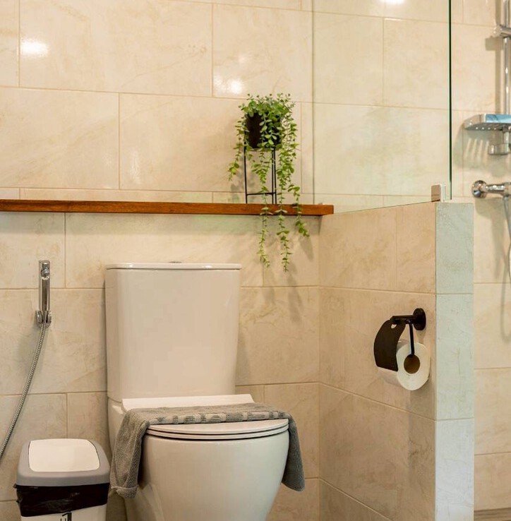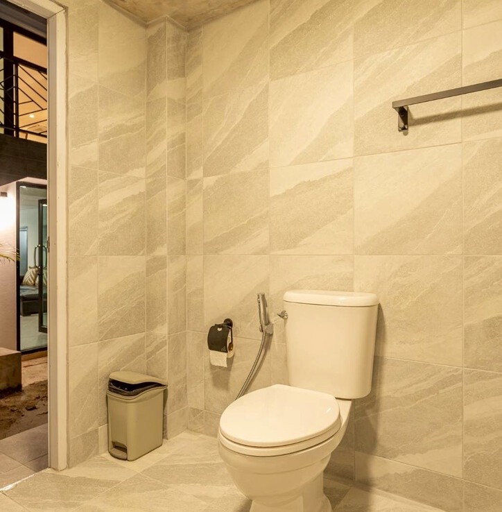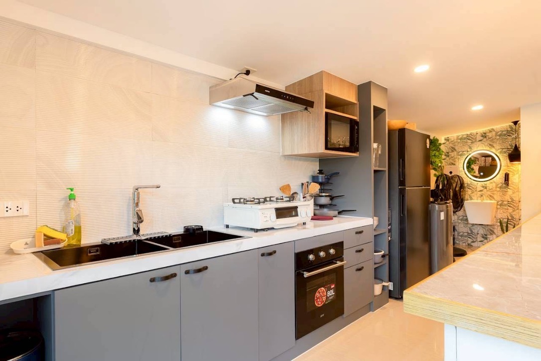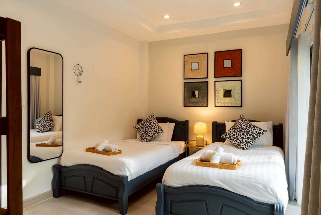 The interior offers an open-plan living concept comprising a television lounge, reading corner, dining area with island counter, and a fully equipped Western kitchen with direct access to the pool terrace. A utility area and guest bathroom are conveniently located adjacent to the kitchen. The home includes four fully furnished bedrooms—two with king-sized beds and two with twin beds—each with its own en-suite bathroom.