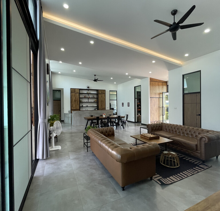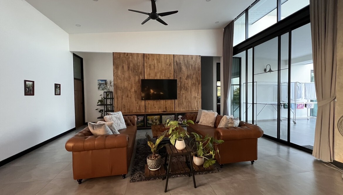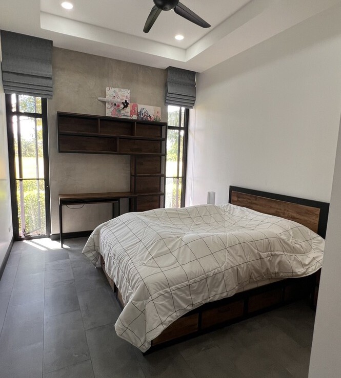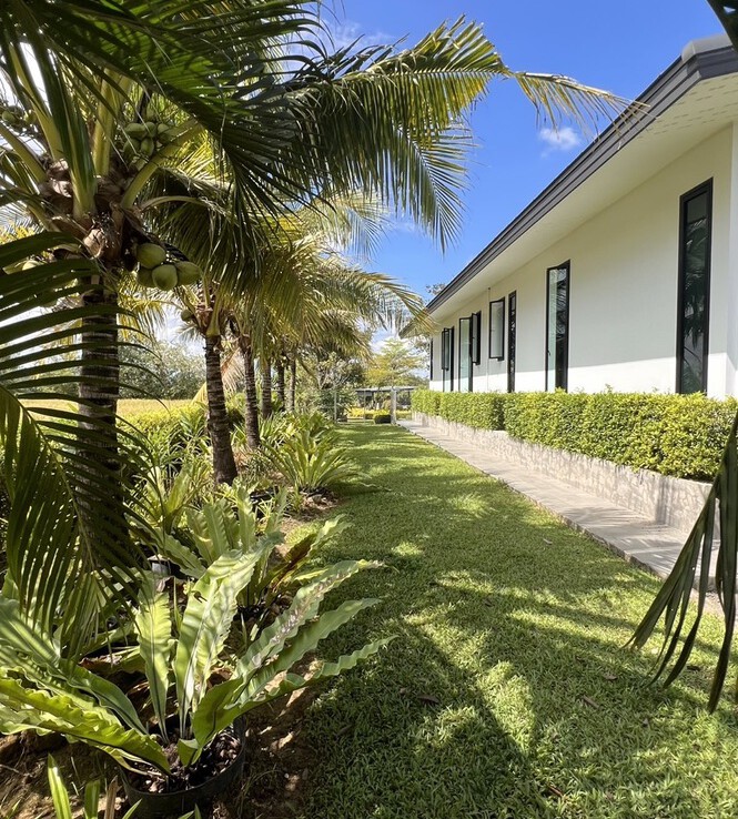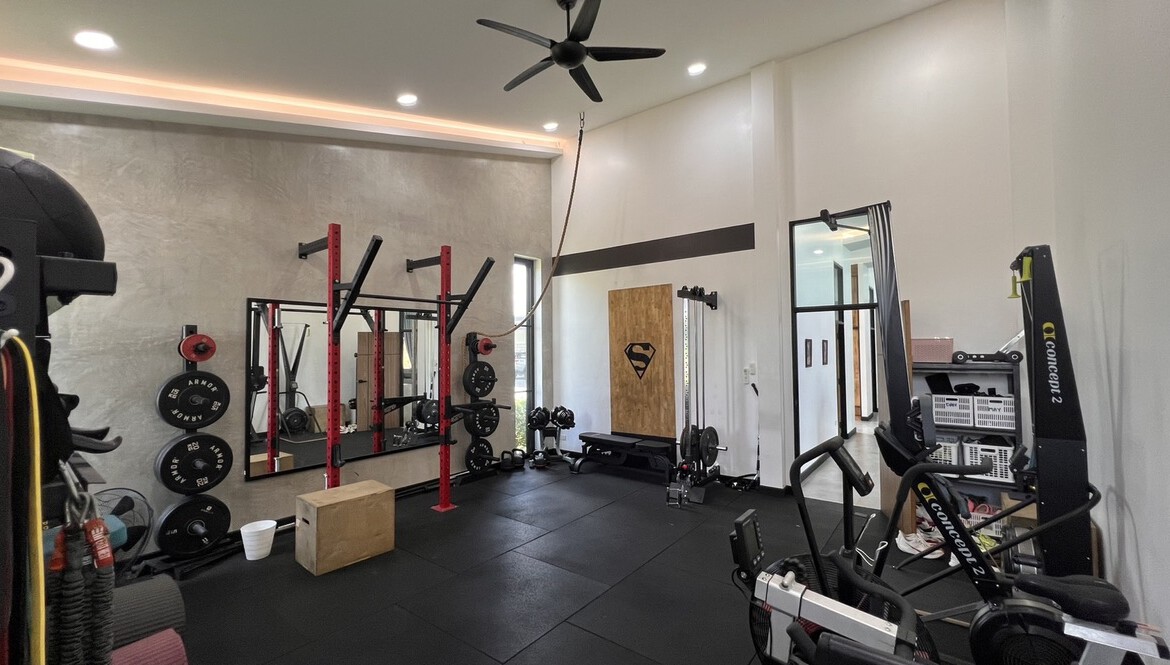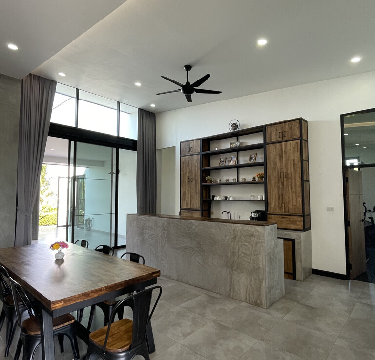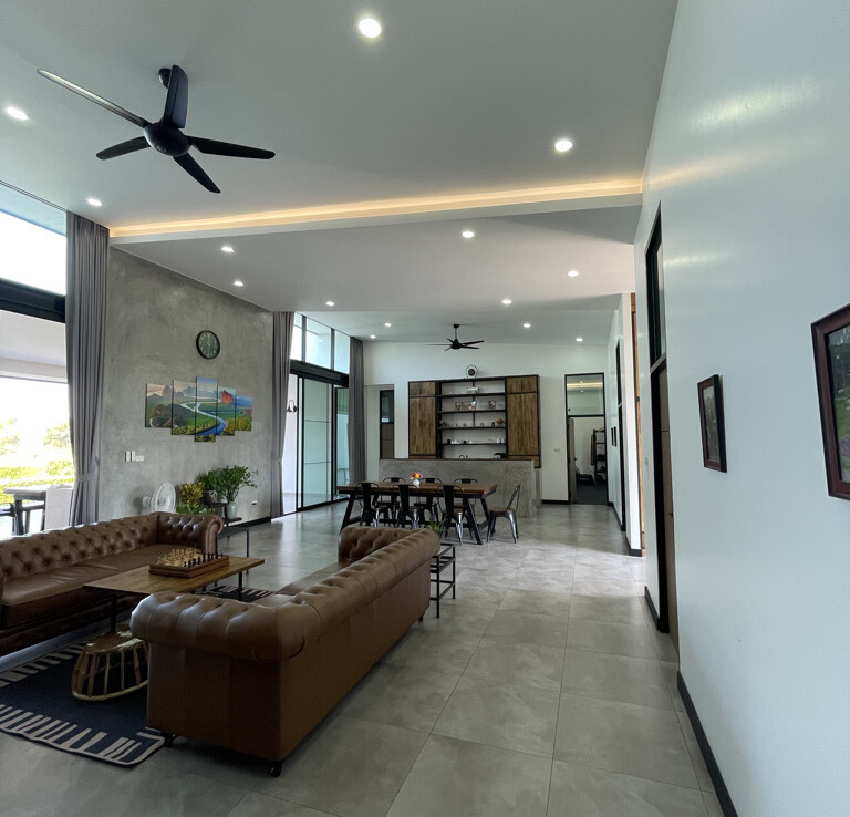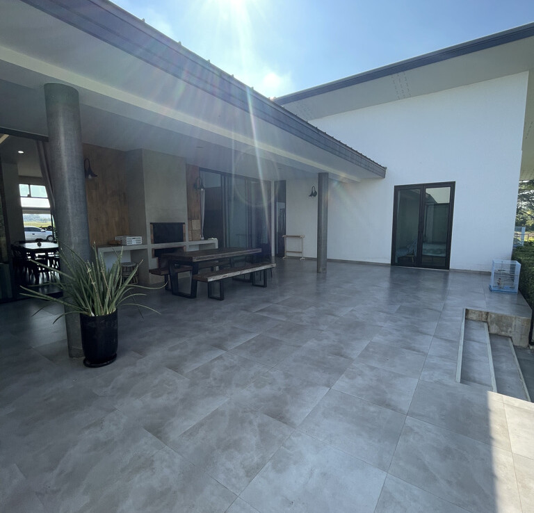 An automated gate opens to a beautiful gravel driveway and landscaped garden with a garage for 3 cars to the left where also the solar system and generator are located. The front porch of the house opens up to a large open plan living with floor to ceiling glass doors access to the garden. Open plan sitting area and dining area with a pantry bar . A study/office room is facing the front of the house then there is a fully equipped fitness room. On the other side is a multipurpose room currently being used as a laundry room. On the left wing of the living area are three guest bedrooms, one is ensuite and the other two share a family bathroom. To the right of the living room, next to the fitness room is the master bedroom with a dressing room and ensuite with a shower. Then from the pantry there is access to the spacious Western kitchen complete with a storage room with floor to ceiling shelves for pantry goods. The interior of the house is in a modern monotone theme yet giving out a warm and friendly vibe with its tall ceiling and no fuss furniture. All rooms come with built-in closet spaces, a/c and ceiling fans.