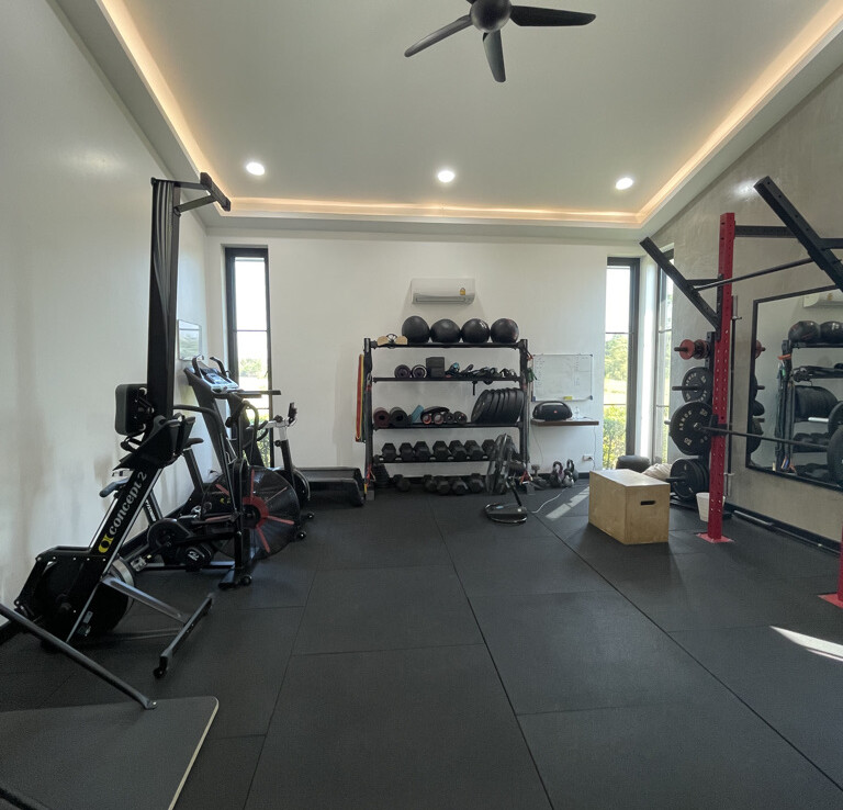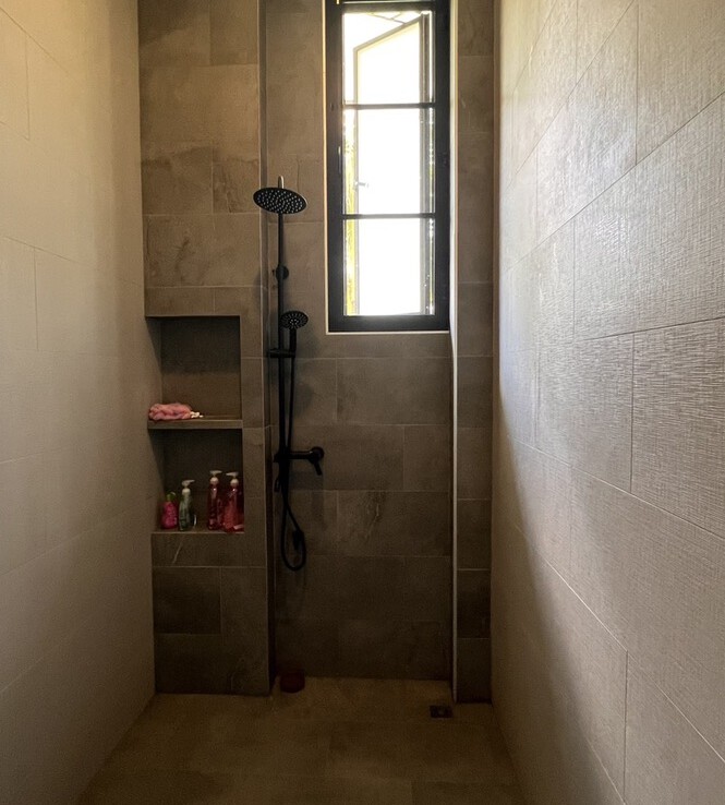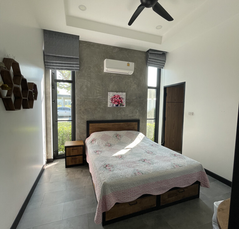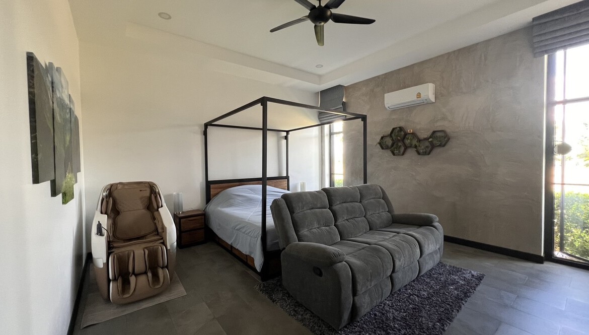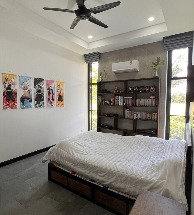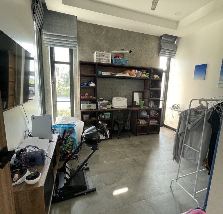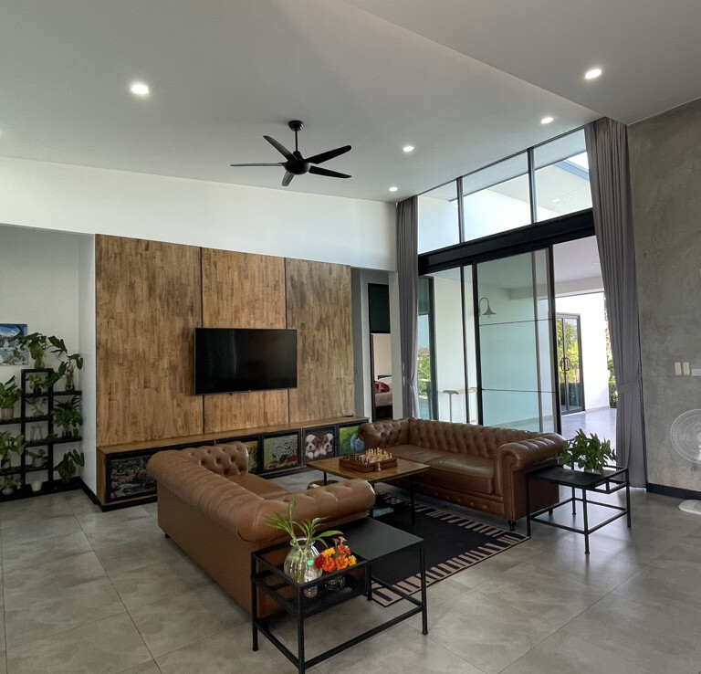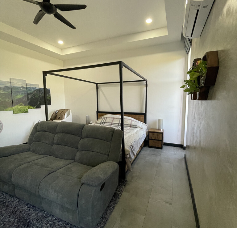 An automated gate opens to a beautiful gravel driveway and landscaped garden with a garage for 3 cars to the left where also the solar system and generator are located. The front porch of the house opens up to a large open plan living with floor to ceiling glass doors access to the garden. Open plan sitting area and dining area with a pantry bar . A study/office room is facing the front of the house then there is a fully equipped fitness room. On the other side is a multipurpose room currently being used as a laundry room. On the left wing of the living area are three guest bedrooms, one is ensuite and the other two share a family bathroom. To the right of the living room, next to the fitness room is the master bedroom with a dressing room and ensuite with a shower. Then from the pantry there is access to the spacious Western kitchen complete with a storage room with floor to ceiling shelves for pantry goods. The interior of the house is in a modern monotone theme yet giving out a warm and friendly vibe with its tall ceiling and no fuss furniture. All rooms come with built-in closet spaces, a/c and ceiling fans.