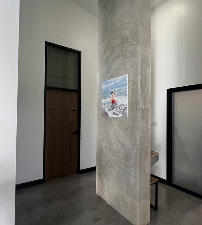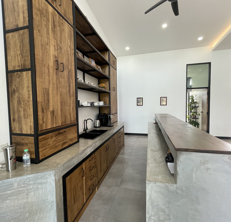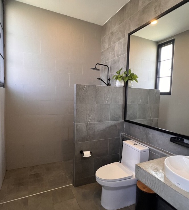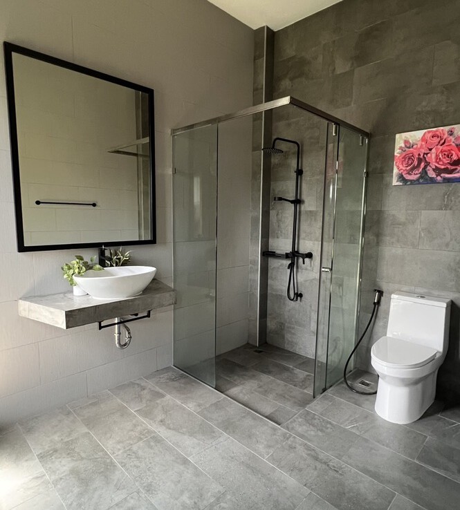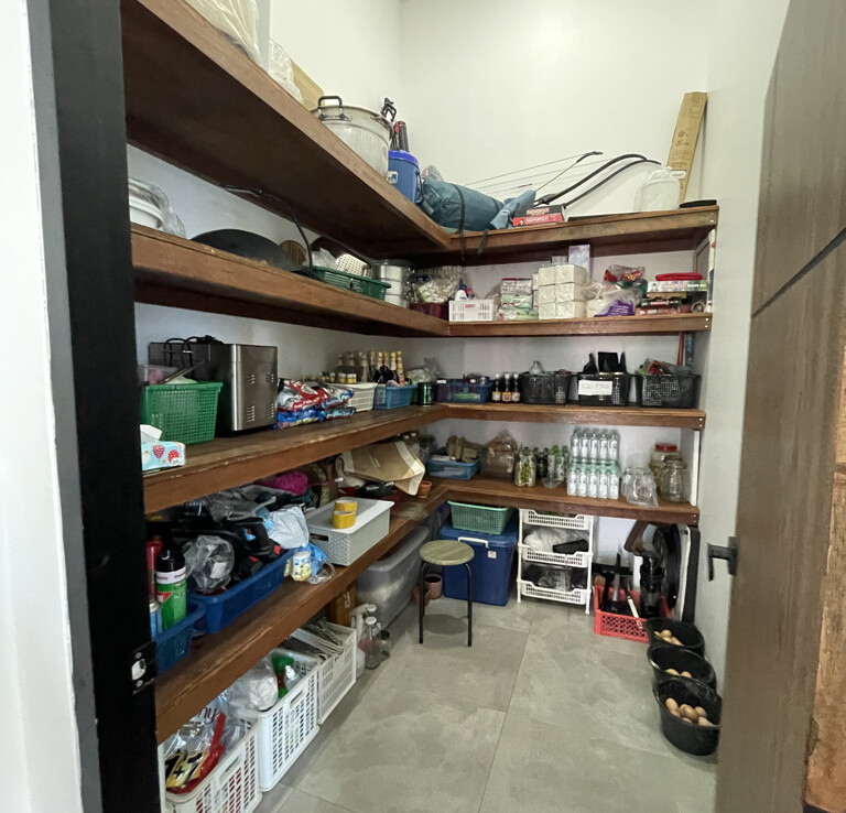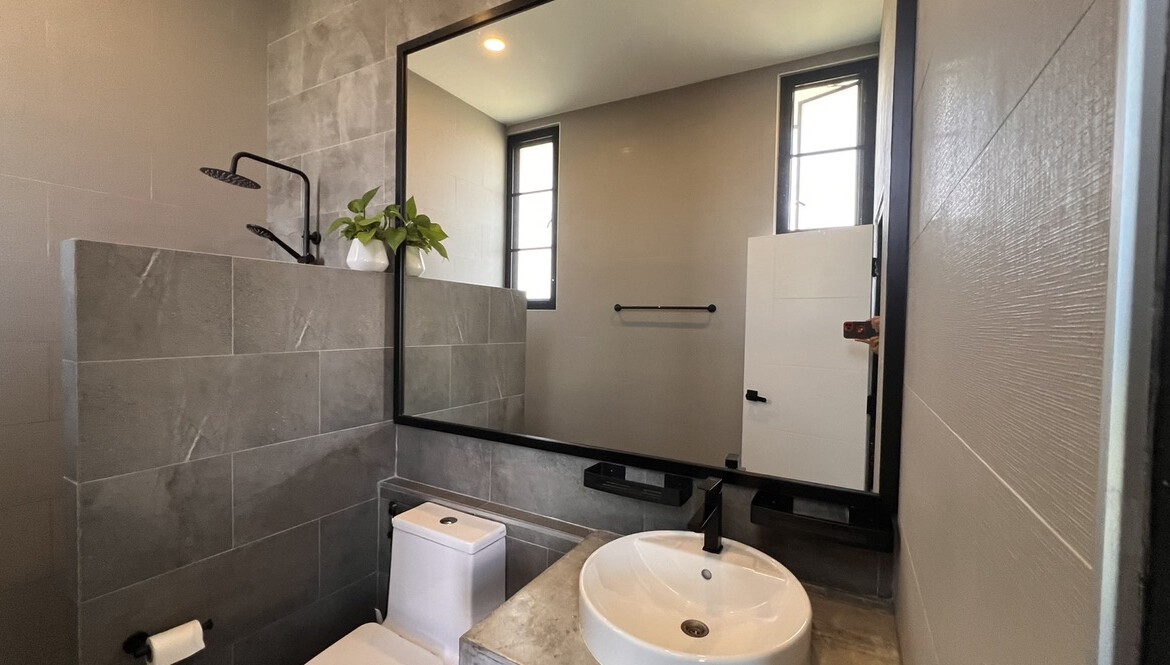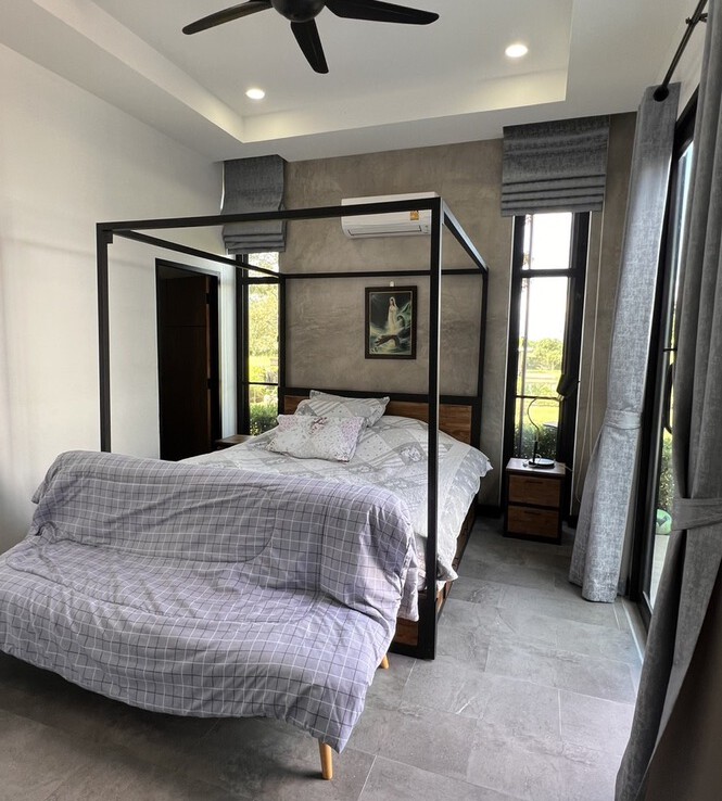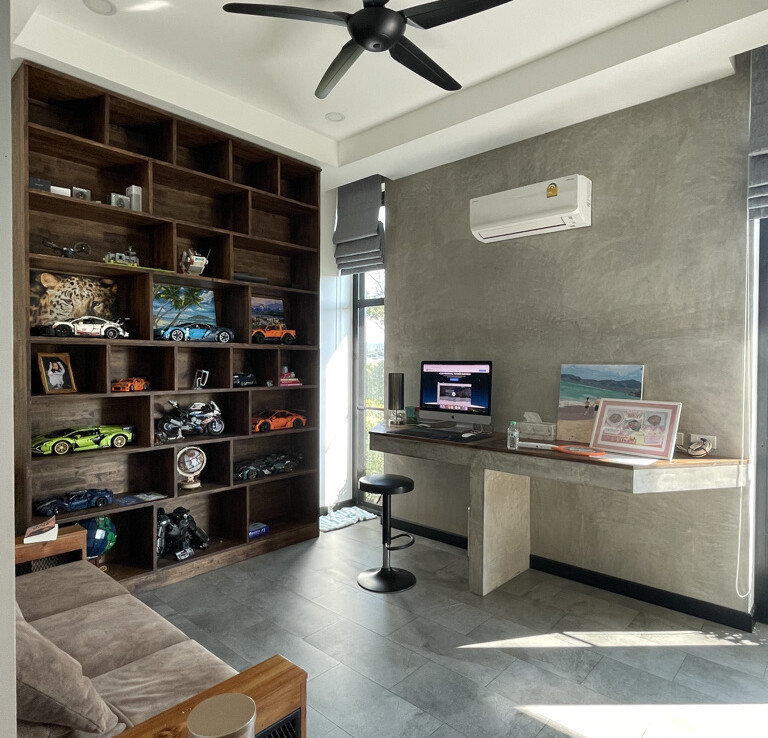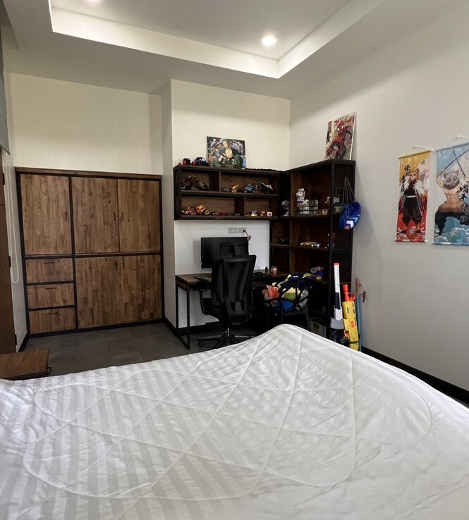 An automated gate opens to a beautiful gravel driveway and landscaped garden with a garage for 3 cars to the left where also the solar system and generator are located. The front porch of the house opens up to a large open plan living with floor to ceiling glass doors access to the garden. Open plan sitting area and dining area with a pantry bar . A study/office room is facing the front of the house then there is a fully equipped fitness room. On the other side is a multipurpose room currently being used as a laundry room. On the left wing of the living area are three guest bedrooms, one is ensuite and the other two share a family bathroom. To the right of the living room, next to the fitness room is the master bedroom with a dressing room and ensuite with a shower. Then from the pantry there is access to the spacious Western kitchen complete with a storage room with floor to ceiling shelves for pantry goods. The interior of the house is in a modern monotone theme yet giving out a warm and friendly vibe with its tall ceiling and no fuss furniture. All rooms come with built-in closet spaces, a/c and ceiling fans.