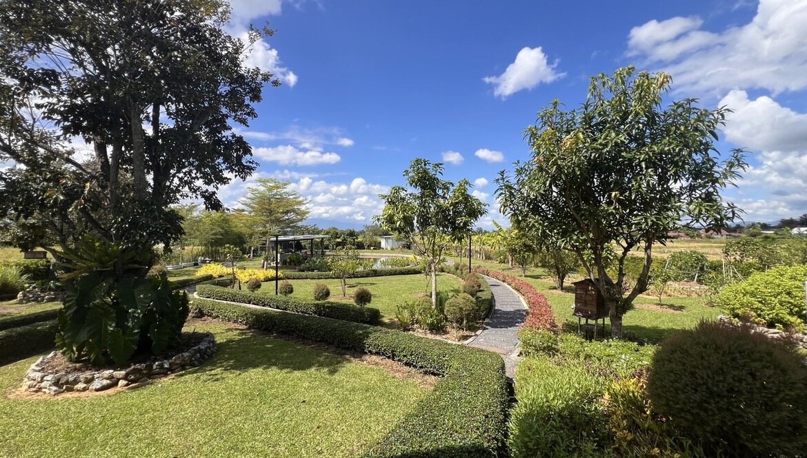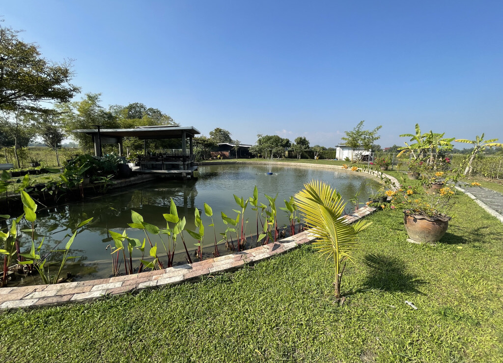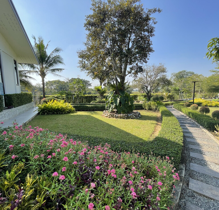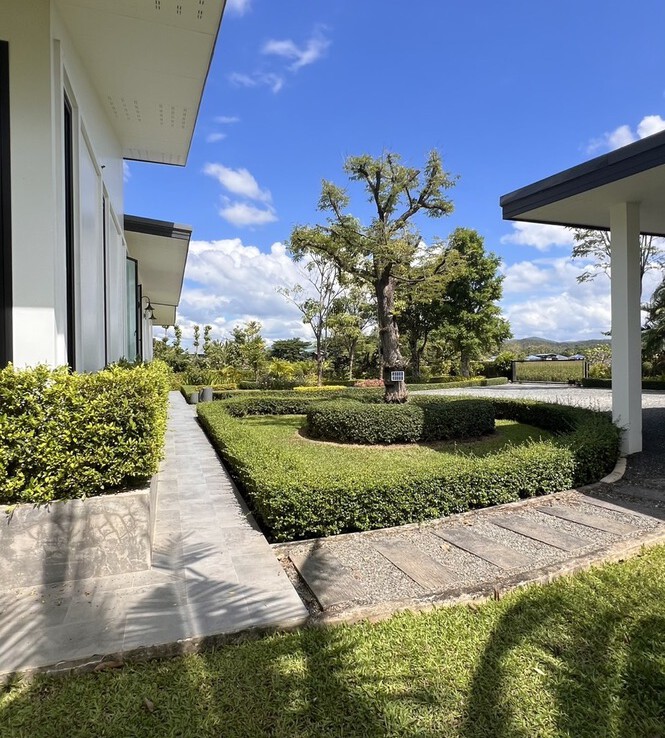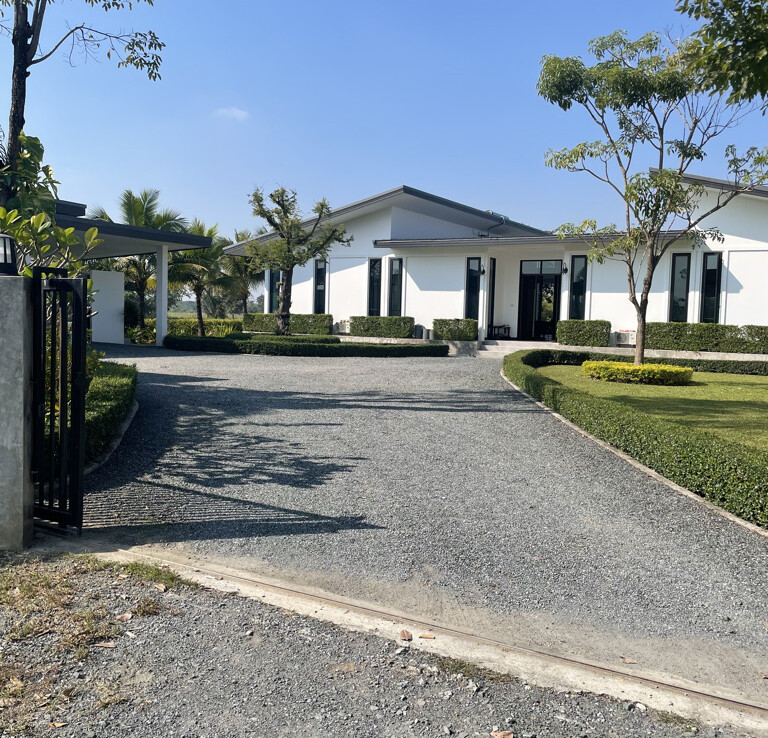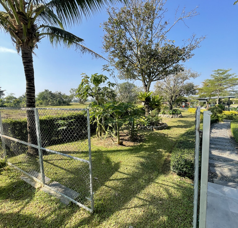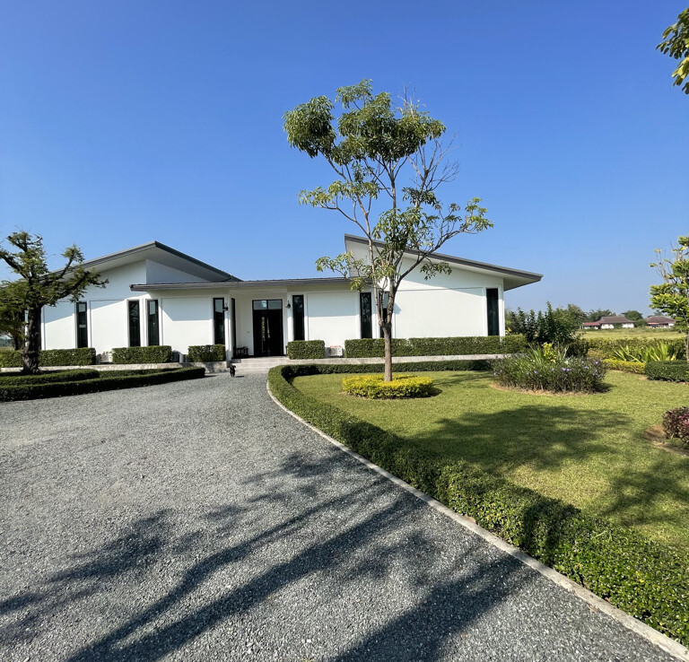 Custom built modern style one storey 5 bedroom family home with 2 rais (3200 sqm) of garden and mini farm land for sale in Doi Saket area of Chiang Mai. Situated in the countryside with rice paddy mountain view, the home is a mere 5km from the Doi Saket town center and 10 minutes drive to the hospital. 18 minutes drive to Meta Mall and 27 minutes drive to Central Chiang Mai. About 35 to 40 minutes drive to the airport.
