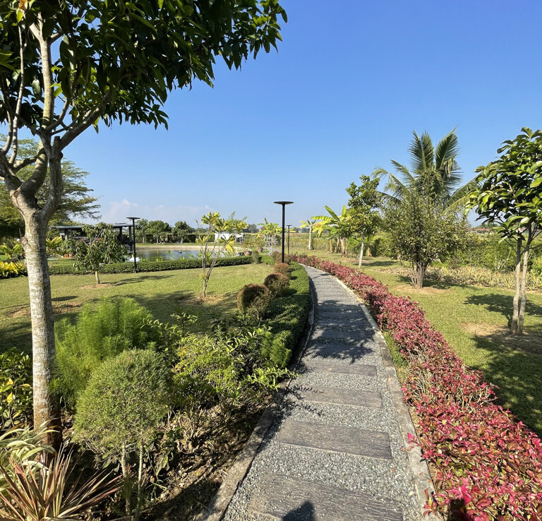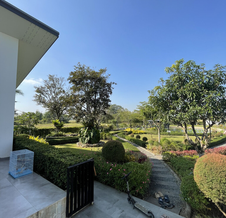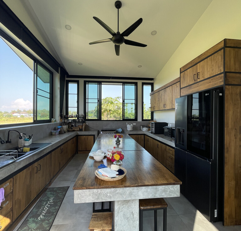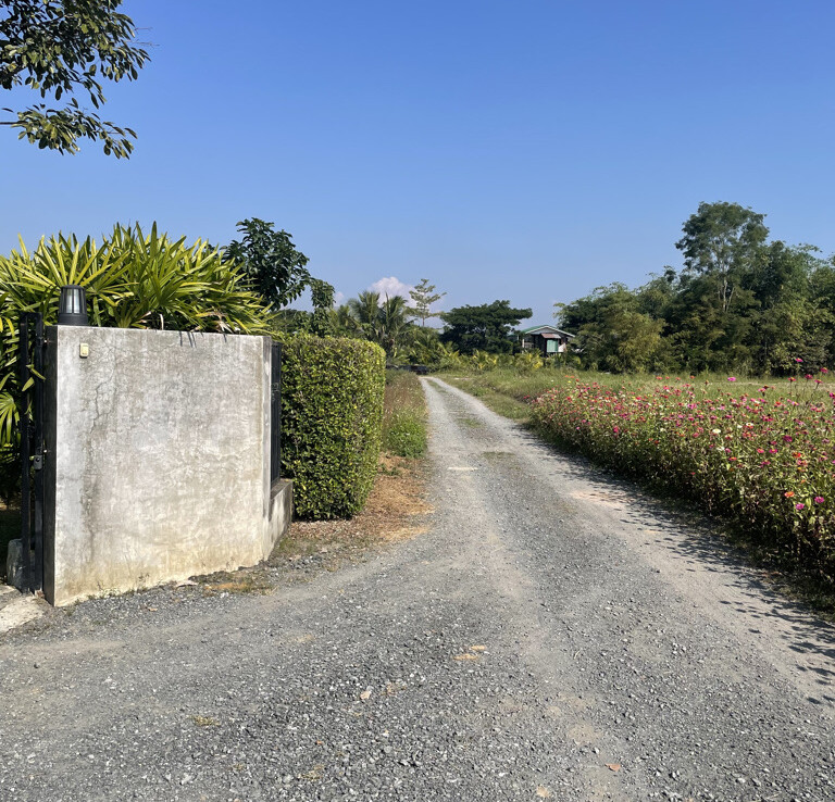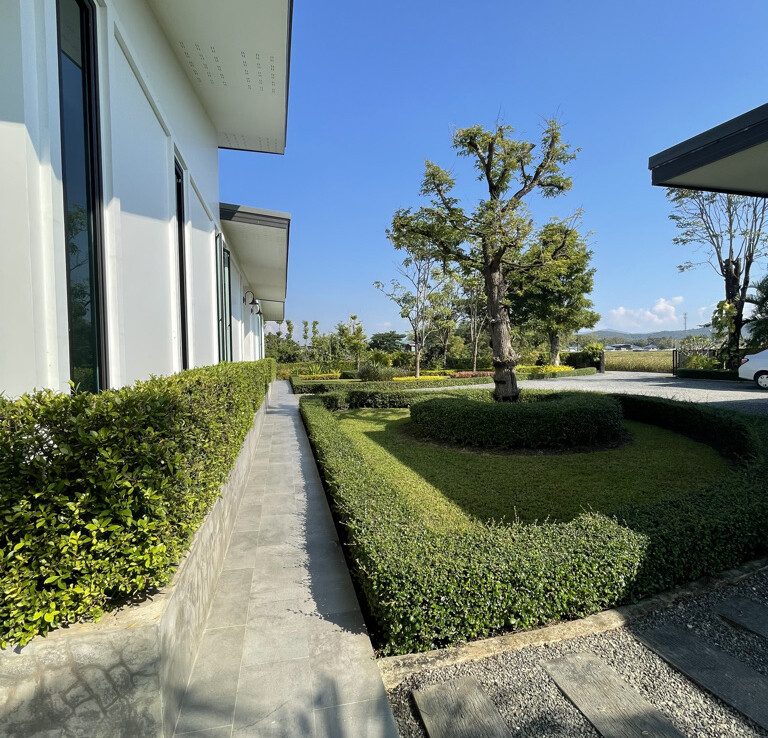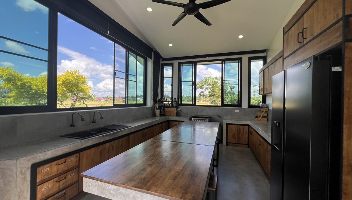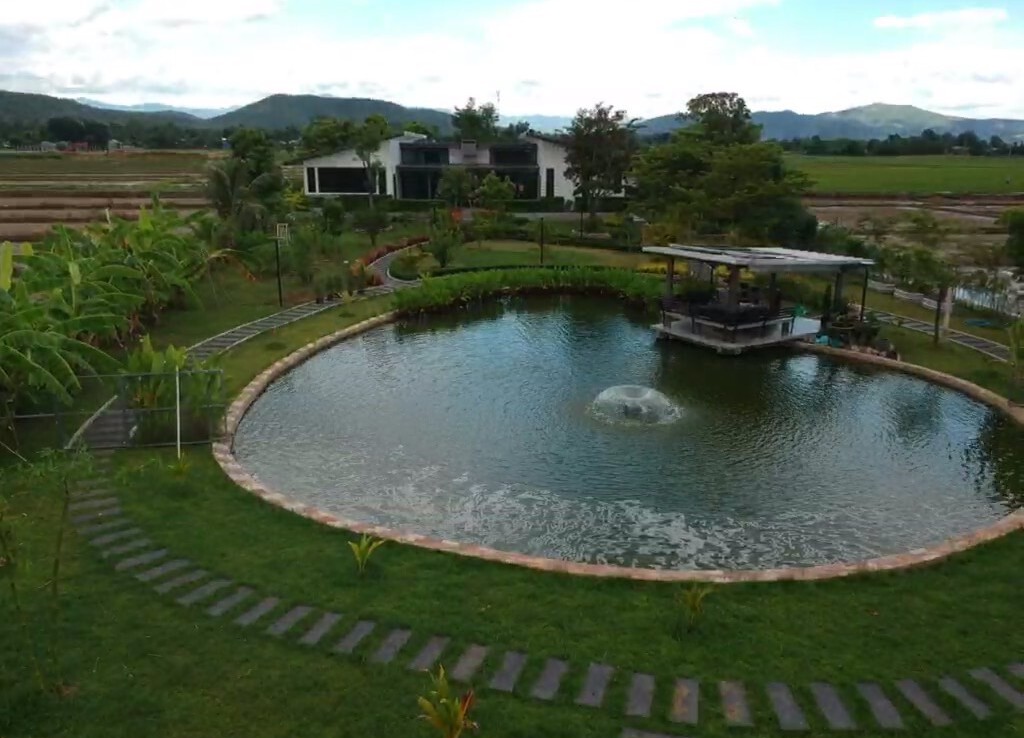 Custom built modern style one storey 5 bedroom family home with 2 rais (3200 sqm) of garden and mini farm land for sale in Doi Saket area of Chiang Mai. Situated in the countryside with rice paddy mountain view, the home is a mere 5km from the Doi Saket town center and 10 minutes drive to the hospital. 18 minutes drive to Meta Mall and 27 minutes drive to Central Chiang Mai. About 35 to 40 minutes drive to the airport.