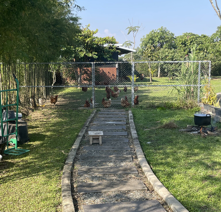 The back garden consists of landscaped pathways leading to the pond with a gazebo to sit and enjoy nature. There is a vegetable garden and a large chicken pen. Well designed, the house truly enjoys and blends perfectly with nature yet offers modern comfort for the whole family.